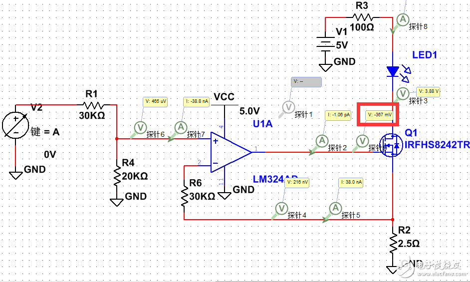 用LM324设计的一个电路,5V单电源供电,输入为0V(万用表测量有0.6mV),负反馈也是0.6mv,输出电压有1.8V多,我看LM324输入失调电压为3mv,输出1.8V跟输入失调电压用关系吗?或者与MOS管的漏电流影响的输出?