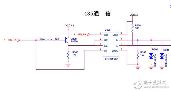 从图中可见,2、3脚需要与4脚(485_TX)相反的输入信号,故用三极管Q300对 485_TX 进行电平转换,以满足要求。