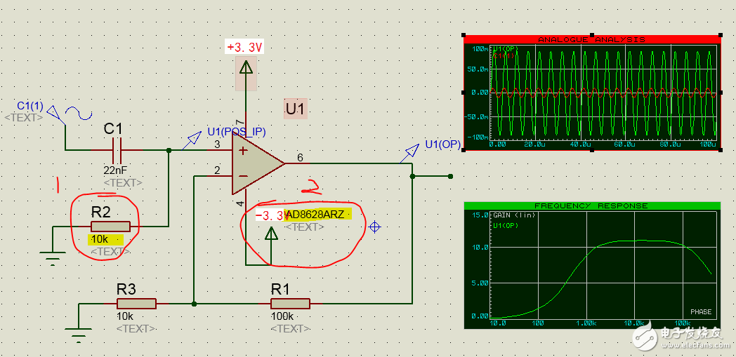 下图是仿真,电路无论单电源、双电源都是没有问题的(注意为了便于观察,频响单位是放大倍数,而不是dB数)