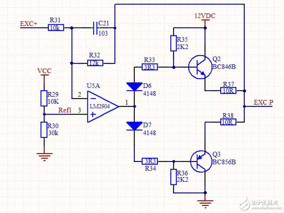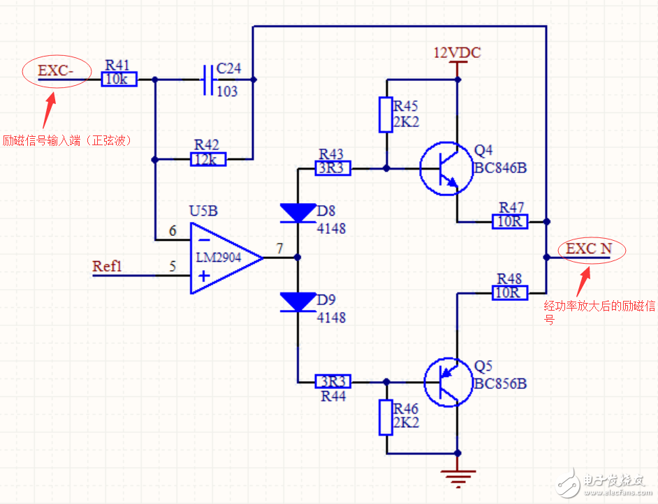 请问各位大神,上面两幅图中左侧的EXC+和EXC-是旋转变压器正弦波励磁信号,经过功率放大后变为EXC P和EXC N,但我不懂这个功率放大电路的工作原理? 这个电路是如何进行功率放大的? 恳请各位大神指点