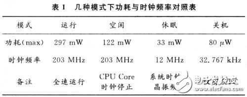 处理器的功耗与时钟频率密切相关。以SAM- SUNG S3C2410x(32 b ARM 920T内核)为例,它提供了四种工作模式:正常模式、空闲模式、休眠模式、关机模式。各种模式的功耗如表1所示。