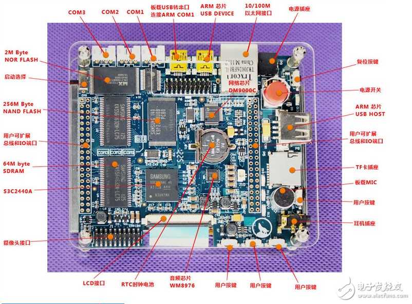 网络:100Mbps低功耗嵌入式专用以太网网络芯片DM9000A,接口为标准RJ45插座
