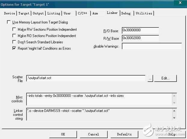 另外是Linker页的设置,把Use Memory Layout form Target Dialog的小钩去掉,在R/O base与R/W base设置,另外我这里使用了分散加载文件Scatter,在Scatter file中添加,misc controls中要设置--entry入口地址0x30000000与SDRAM地址对应,输入