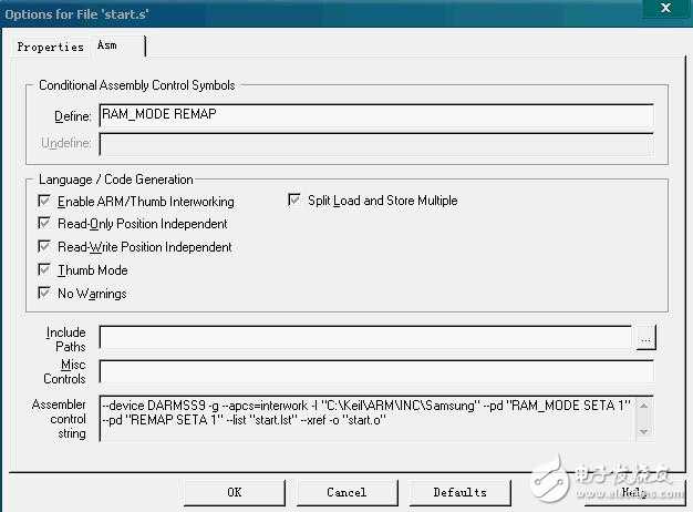 如果是在SDRAM中调试,还要打开start.s的option选项,在Asm页Define输入RAM_MODE REMAP