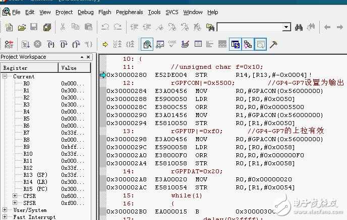 设置基本完成,编译Build工程,通过后,打开运行H-JTAG,点Debug就可以了, 看到开始Debug时候PC已经不是在0x00000000地址,而是到到0x30000280了,直接到了Mail函数了。 SDRAM调试成功,但是曾经出现程序跑飞的情况,有地方说是SDRAM初始化问题,以后再跟进,解决这个问题。 上面程序跑飞的问题,实际是由于本来我的板子NAND FLASH里面有程序,有VIVi跟wince,VIVI把wince的镜像释放到SDRAM中,使我的程序跑飞了,解决办法是把nand flash清空,或在VIVI释放镜像前进入DEBUG。