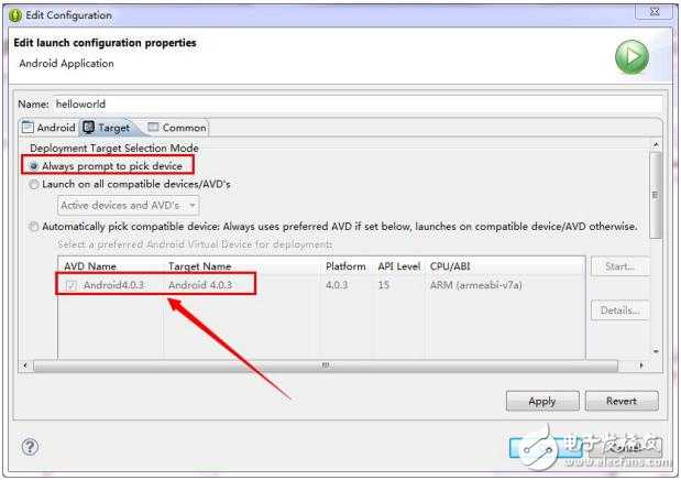 如下图所示,先选择红色箭头指的“Android4.0.3”,然后选择“Always prompt to pick