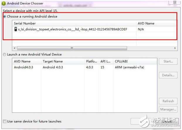 选中 helloworld工程,选择菜单“Run->Run”,弹出如下图所示的“Android Device Chooser”设备选择框。
