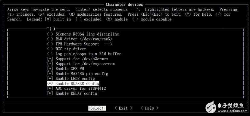 9)选择” Device Drivers “->"Character devices"->"Enable BUZZER config",如下图所示: