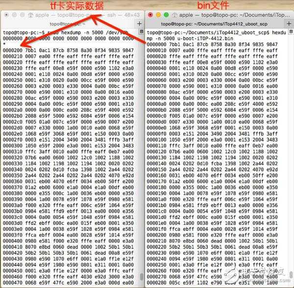 我们需要确定从tf/sd卡的第一个block开始处,确实正确烧写了u-boot-iTOP-4412.bin这个文件,下面我们对比一下,用到的命令同样还是hexdump。