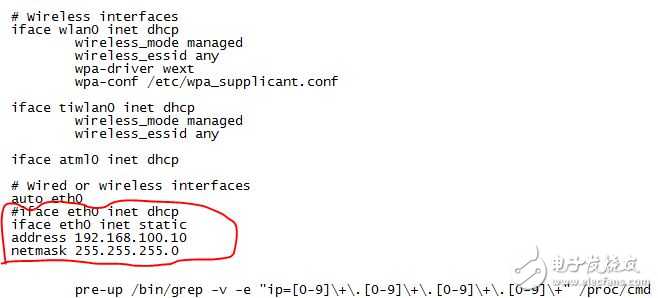 由於木有路由器,輸入ifconfig命令,板子沒有獲取到IP地址,需要手動修改板子IP地址,使用vi打开/etc/network/interfaces 目录,修改如圖: