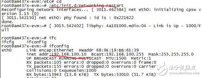 退出,保存,不想重啓板子,可以重啓網口,輸入/etc/init.d/networking restart,看到網口重啓後,ifconfig