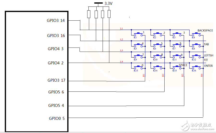 以上述原理图为例,我们设置L1-L4对应的I/O为输入,并且配置为带中断的I/O口,R1-R4对应的I/O口为输出。在键值开始扫描之前,设置R1-R4输出为低电平,当用户按下某个键后,对对应的行中断线被拉低,触发下降沿中断,在中断处理函数中,依次设置R1为0,看看这一列中的哪一行为0输入,如果没有0输入,机械R2输出0,看看R2这一列哪一行输入为0,依次类推,直到确定触发中断的那个按钮所在的行和列,这样我们就可计算该键的键值KEB-VAL=4*ROW + COL。