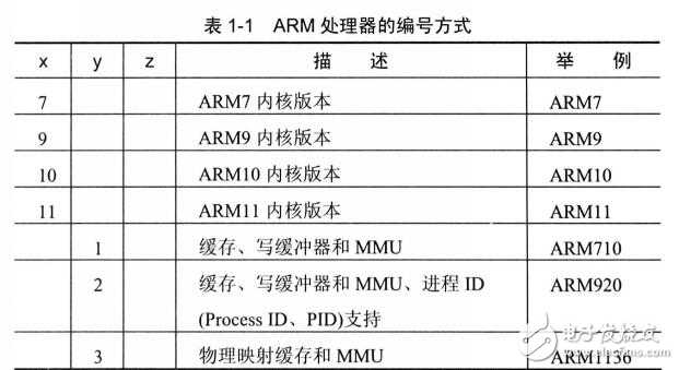 第一批内核,被称为经典的处理器,使用的命名约定如表所示。第一个数(x)对应内核版本。第二和第三个数字(y和z)分别对应缓存(cache)/存储管理单元(MMU)/MPU信息和缓存大小。