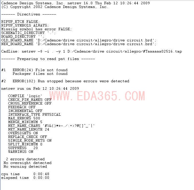用orcad画了一个电路图,经过修改DRC终于没有错了,但是生成网络表时却出现了错误,信息如下: