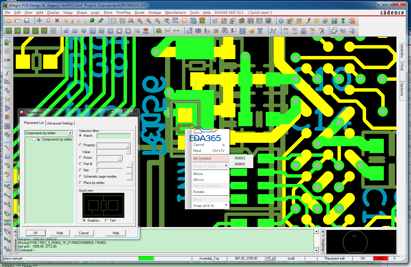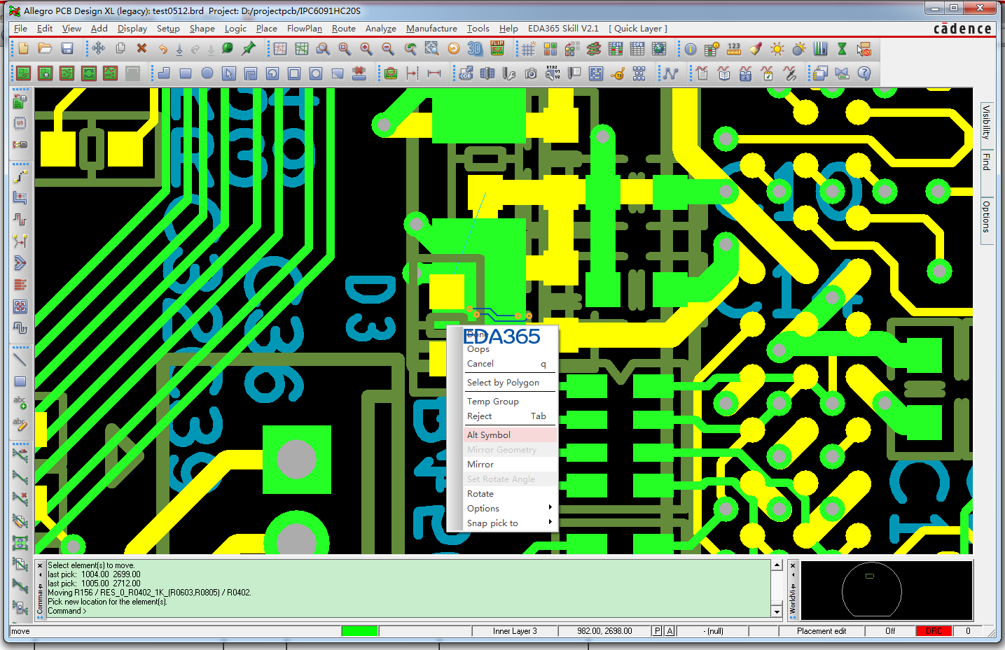 这种方法在导入PCB EDIT 后,选择“move ”,再选择对应的封装,不会出现,可以切换的封装列表,但是可以每点一下“alt_symbol”可以循环切换:(如图1)