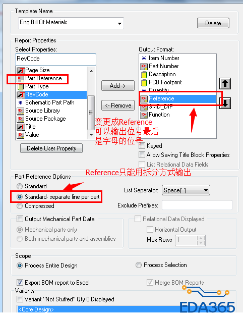 把Part Reference输出改成出 Reference,再把输出改成拆分BOM方式,BOM输出后用三方软件合并BOM即可!