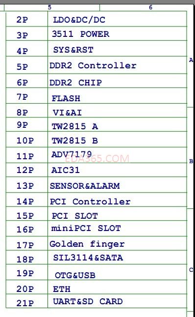 同意6楼的说法,2P就是第二页是LDO和DC/DC电源部分的电路,3P是3511的电源部分,4P是系统和复位部分,5P是DDR2的控制器,6P是DDR2芯片,7P是FLASH部分,等等。
