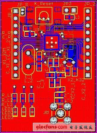 板子不对称,你这个是带MCU的RF芯片吧?RF引脚下面不要走VCC,从你BOTTOM层看到有根VCC走了.每块RF芯片都有芯片的LAYOUT布线规则手册,其他部分不说,你芯片引脚到RF天线这块要非常注意,直接影响到无线数据通信的距离和质量.还有你的丝印,麻烦放好点,放精制点```总的来说,这个板子线是都连好了,可是还可以完善很多的,比如RF天线这块,旁边全部打GND过孔包着,布局以及板型都要再做精致点.
