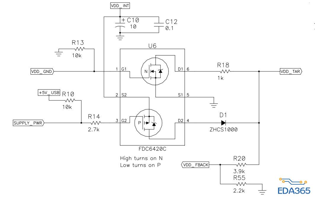 fdc6420。电源保护,如果VCC_GND电压过高,则将VCC_TAR拉至地电平。供电电压过低,则VCC_TAR由VCC_INT供电。同时采样VCC_TAR电压做反馈。