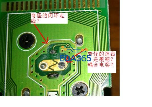 3. 其中一个元件的两个引脚用奇怪的方式(疑问4)处理,这是做是为了耦合电容吗?