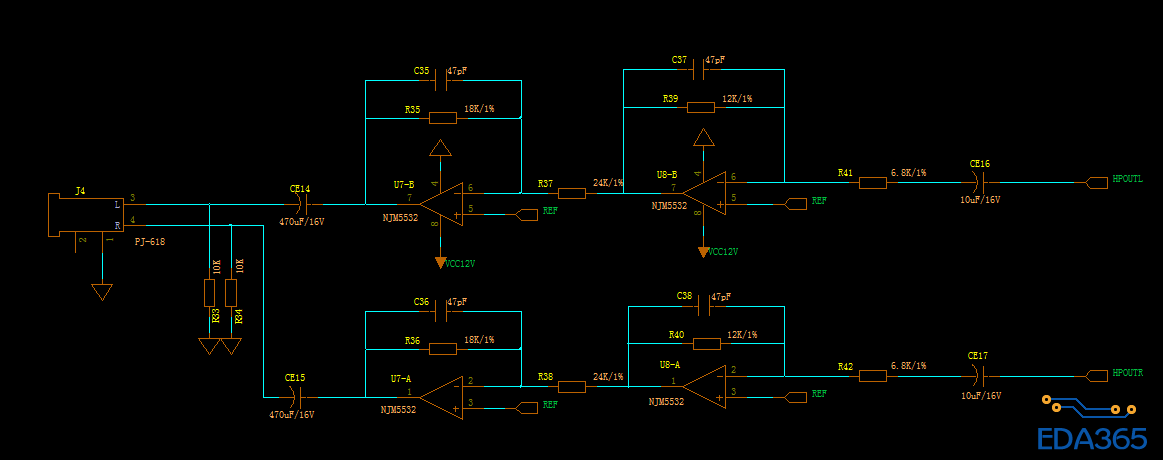 U7输出端与CE14和CE15先改为22UF,和耳机之间串360欧的电阻, 输出频响是不影响的,截止频率为20HZ,