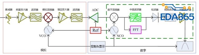 SSA3000X由模拟部分和数字部分组成。模拟部分将输入信号转换为模数转换器(ADC)可以接受的电压范围和频率范围以实现数字化。数字部分对离散化之后的数字信号进行中频滤波、检波、视频滤波等一系列处理之后送屏幕显示。