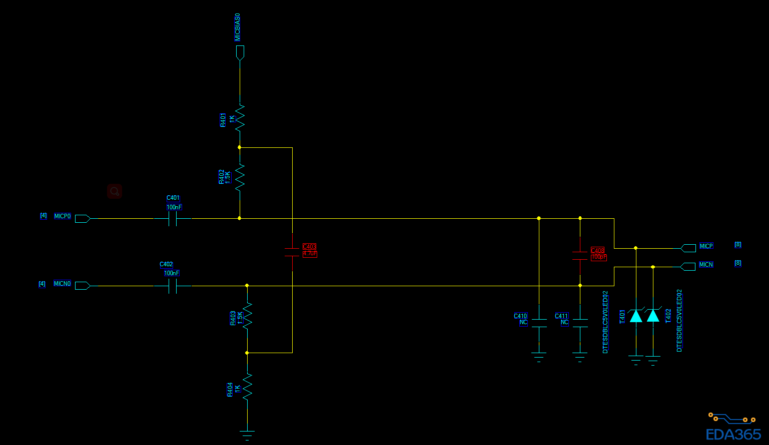 R401,C403,R404构成RC滤波电路,MIC的偏置电压(具体看规格书)可调整这几个的值计算。