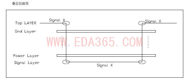 信号 Signal X 从源IC 脚 出来 走TOP Layer(参考GND) 经VIA到内层(参考电源 POWER 平面);再由内层经VIA 到TOP Layer到目的IC 脚;