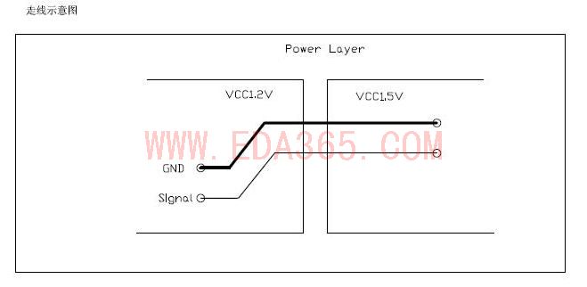 当信号参考电源平面时,由于电源平面经常被分割,致使信号不得不跨区走线,这时,大多采用的方法是在两个区域间用电容连接作为回流路径;这个暂不做讨论;