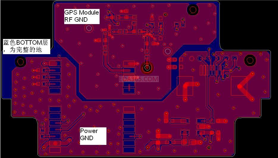 第三幅,第四幅:GPS地分割2.JPG GPS地分割2——1.JPG,从图上可以看出,每层的地都作了分割,并桥的位置在同一位置,电源层是个完整的。不过有个问题不明白,有人说地噪声会通过电源与地平面进入到地层,这样不还是有问题吗?