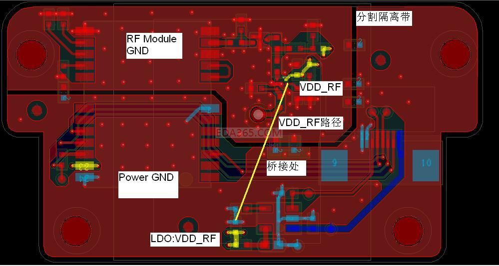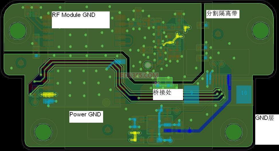 我们通过设计,让RF信号的地远离这个回流的地,再通磁珠或0ohm电阻,将这2个地连接起来(保证地平面完整).