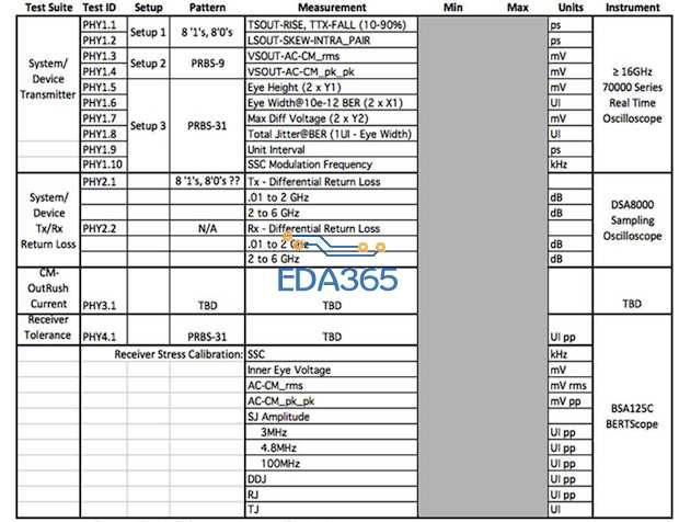 Since the Thunderbolt spec is currently in transition from a 0.6 version it should be noted that the current measurement list shown in Table 1 is likely to grow or change as the specification reaches its final 1.0 version. Today this table constitutes the full extent of the physical layer validation requirements.