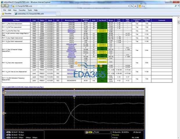 It is important to remember that Thunderbolt has two Tx pairs and two Rx pairs. When analyzing the Tx lines, it’s helpful to have instrumentation with sufficient performance to analyze these lanes at the same time. A 4-channel oscilloscope with at least 20 GHz bandwidth per channel makes it possible to put all the lines on the instrument and to analyze both differential channel pairs in a single snapshot. Figure 7 illustrates the use of a jitter and timing analysis toolset to perform the full set of Thunderbolt AC parametric and jitter measurements while in a debug mode with customized settings. Documenting test results is made easier with automated report generation as shown in Figure 8.