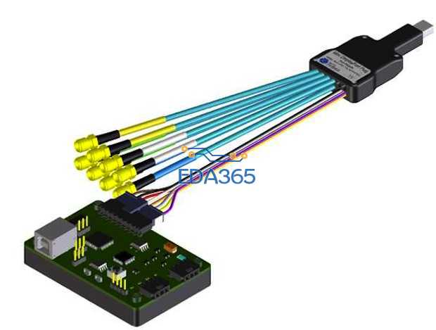 As with most high-speed serial standards, connectivity to the signal under test is critical. Figure 9 shows a “Digital Port Micro” controller and plug fixture which attaches to the lower speed serial UART and is used to either interact with the receiver’s error counters, or to instruct a transmitter to broadcast a specific pattern type. The unit shown will support up to four high-speed differential pairs. It also includes eight low-speed signal lines for control and power testing.