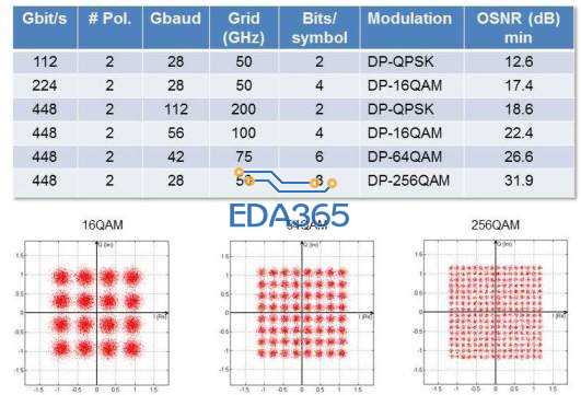 Researchers are evaluating a number of advanced modulation schemes and channel sizes for use at 400G, as shown in Figure 1. In general, the higher order modulation techniques, such as 16QAM and 64QAM, encode more bits per symbol and can be squeezed into smaller channel sizes, but with the previously mentioned tradeoff of much higher OSNR requirements.