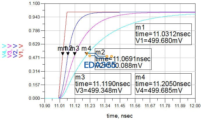 不过这里激励为理想step信号,上升沿为62.5ps(10-90%为50ps),容性延迟没有书中的那么大,这里的延迟分别为38ps,88ps,174ps