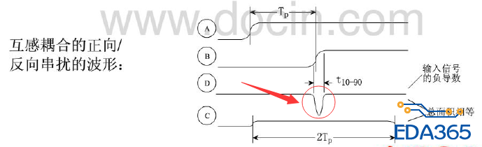 图中显示,远端串扰产生宽带为上升时间的正脉冲,近端串扰产生宽度为2倍传输延迟的正脉冲。