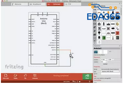 Fritzing平台不仅仅是一个简单的PCB编辑器,而其目的是为创客和骇客真正能够实际创造自己的设计。其设计的目的是为了用户能够实现自己基于Arduino微控制器的设计和创造能用于生产的PCB布线。一旦用户再面包板上设计出了一个实际的电路,然后其可以被转移到编辑器中,其中包含三个不同的项目视角。面包板视角允许用户在虚拟的面包板上拖拉安置虚拟的电子组件。原理图视角则是原理图的正式表达形式,是虚拟面包板上的电路的对应,但用户也可以根据需要进行编辑。最后,PCB视角允许用户将组件放置在虚拟的印刷电路板上,然后就可以用于生产了。