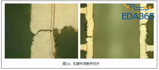 1、电镀铜延展性不佳或板材Z-CTE较大,造成孔中间的孔铜全周拉断且断口较大,如图10所示: