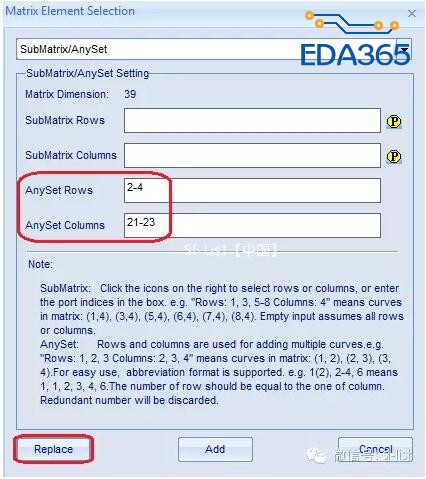 在Matrix Element Selection窗口,设置AnySet Rows为“2-4”, AnySet Columns为“21-23”,点击Replace按键。