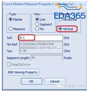 34. 在Z参数显示区域,右键菜单选择Maker。在弹出的窗口,添加Maker Pin,频率设置为1GHz,并勾选SnapToCurve选项。点击OK确认。