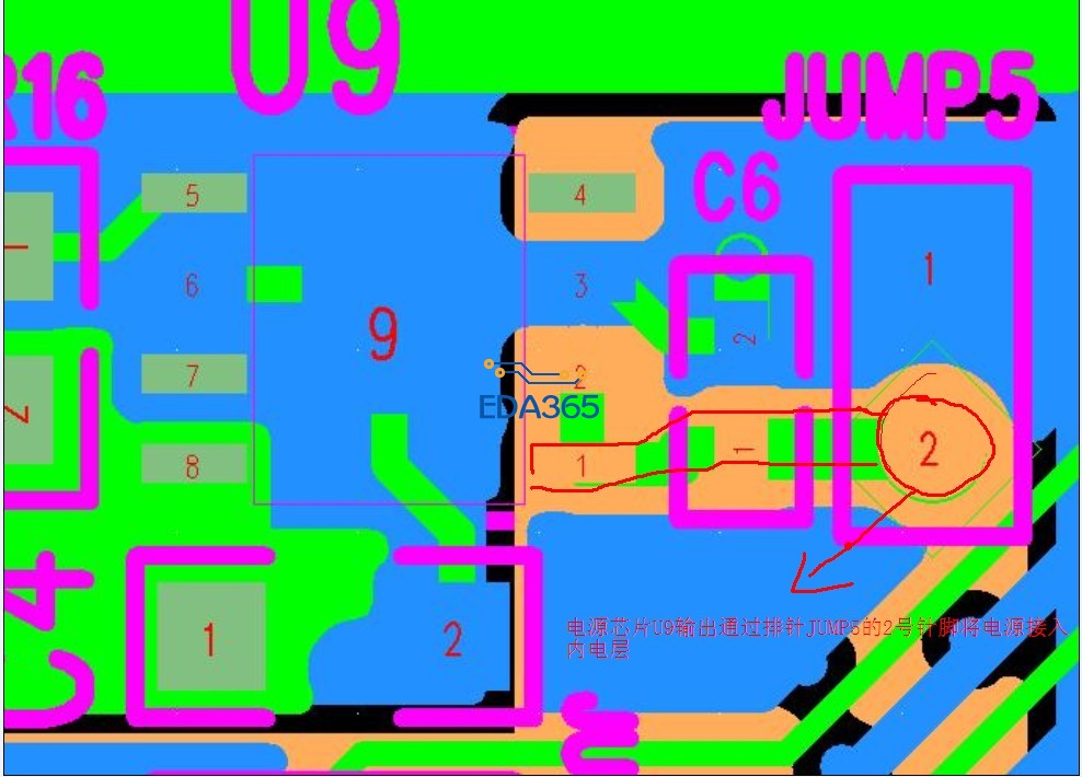 这个是PCB图,是通过排针将U9电源芯片的输出+5V连至JUMP5的2号引脚上,图中橙色为内电源层+5v区域。