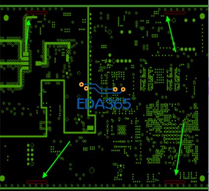 阻抗线的屏蔽层不连续或没有屏蔽到(1电源分割时跨分割 2射频线隔层未注意到 3信号相邻时铺电源铜影响)