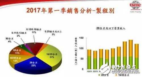 按制程看,台积电28nm以下先进制程工艺占据晶圆代工收益的56%,其中16/20nm工艺、28nm工艺占营收的比重为31%、25%。