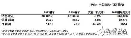 录得营业亏损78亿日元(7000万美元),而上一财年营业利润为145亿日元。利润减少主要由外汇汇率的负面影响、上述2016年熊本地震产生的费用以及对移动产品影像传感器65亿日元(5800万美元)的库存减记所导致。部分被上述销售收入同比增长和与照相模组业务长期资产的减值减少而抵消。在本财年,汇率波动造成了437亿日元负面影响。