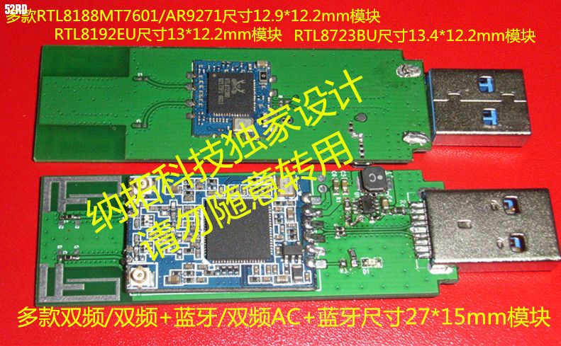经典款的最小尺寸模块(12.9*12.2mm),可以兼容芯片:MT7601;