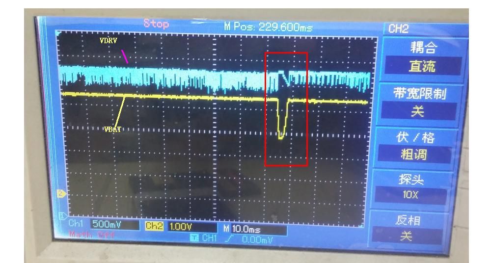 在还没有下入程序前 ,只接USB下载,听到主板上有规律的响声。开始以为是电感或者电容响,后来发现不是。而是MT6328的VDRV去控制充电BJT出现异常,可见附图。导致VBAT输出有规律的被拉低。