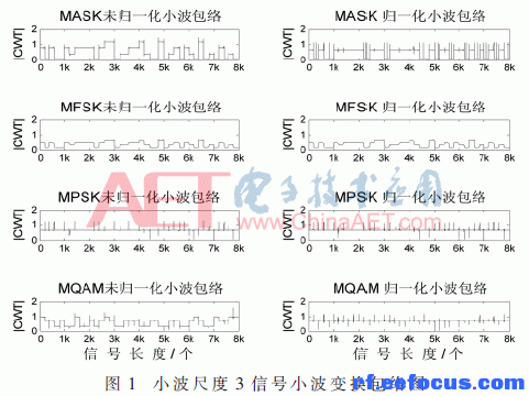 由式(2)~(5)可看出小波变换取其包络后MASK、MQAM包括幅度变化,而MFSK、MPSK不包含,因此对信号进行归一化函数处理,定义为: