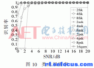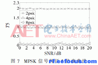 由图6~图8可看出,本文选取的特征参数在信噪比区间内十分稳定。根据图6设定判决门限th4、th5,小于门限th4则判为2FSK,大于门限th5则判为8FSK,两个门限之间则判为4FSK;根据图7设定判决门限th6、th7,大于门限th6则判为2PSK,小于门限th5则判为8PSK,两个门限之间则判为4PSK;根据图8设定判决门限th8、th9,大于门限th8则判为2ASK,小于门限th9则判为8ASK,两个门限之间则判为4ASK。