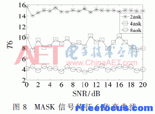 基于MATLAB环境,本文选取10种数字调制信号分别为2ASK、4ASK、8ASK、2FSK、4FSK、8FSK、2PSK、4PSK、8PSK、16QAM。仿真参数设定为:fc=20 kHz,fs=200 kHz,RB=1 kb/s,码元个数100,MFSK信号载波频率设定为f1=5 kHz,f2=10 kHz,f3=15 kHz,f4=20 kHz,f5=25 kHz,f6=30 kHz,f7=35 kHz,f8=40 kHz,加性高斯白噪声,信噪比从0 dB~20 dB的条件下每信噪比分别进行500次实验,信号参数特征变化曲线如图3~图8所示。
